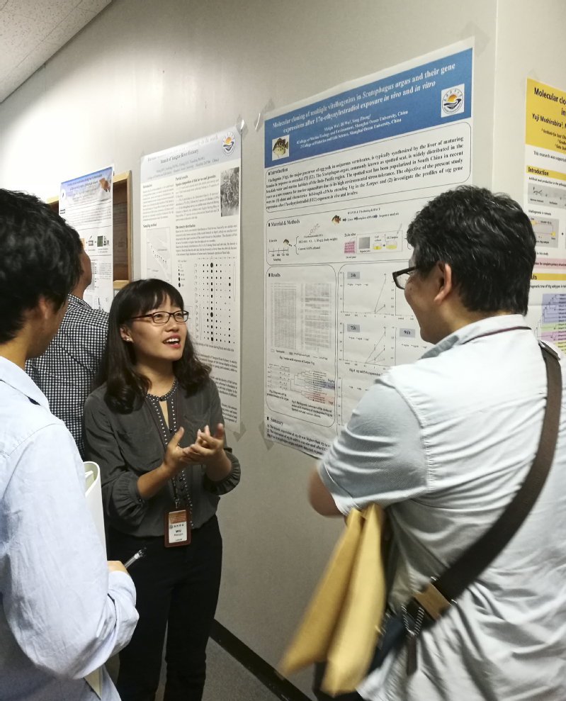在研讨会上,刘利平副教授在特邀专场作了“Mobilization and transfer of body nutrients during artificially induced maturation of the female Japanese eel (Anguilla japonica)”的主题报告,就日本鳗鲡人工促熟过程中营养物质的迁移和转化分享了自己的研究成果,并与大家进行了深入讨论;葛春梅同学作了“Quantitative proteomic reveals the dynamic of protein profile during final oocyte maturation in zebrafish”的口头报告,就斑马鱼卵母细胞成熟期间蛋白质组学提出了新的研究结果。吴美琴博士还主持了一个口头报告专场。此外,钟俊生教授、吴美琴博士、曾娇同学还分别以研究海报的形式图文并茂地作了成果展示。会场上,中日韩三方与会代表对东亚水产动物的繁殖与发育研究交换了意见和想法,并希望能有更加密切的合作和深入的探索。