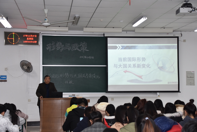 张敏书记从国际战略形势的特点,当前大国关系,以及中国面临的机遇和挑战这给同学们阐述了当前国际形势。当前大国关系发生变化,各国战略走向趋于明朗,中国的发展以及在当前国际形势中的地位不容忽视。随着中国综合实力的增强,国际地位更加突出,成为多方关注的对象,在国际关系格局中处于相对有利地位。同时,也面临着诸多挑战,例如国际贸易保护主义,日本政治右倾化,以及西方渗透战略等,都需要我们的不懈努力来逐步解决。
