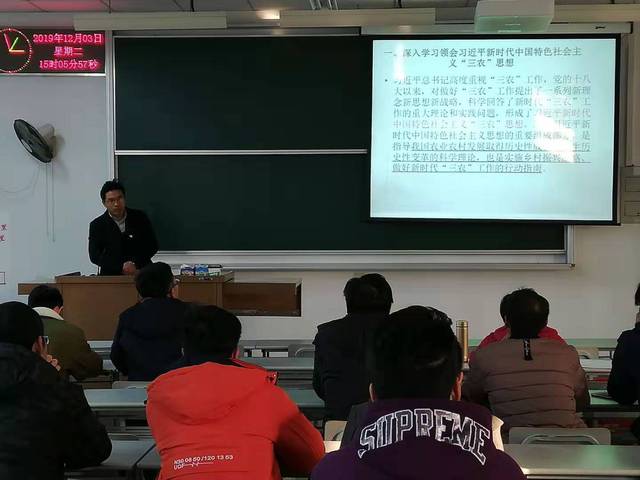 在2212教室,生态系教工党支部书记管卫兵老师围绕“学习贯彻习近平中国特色社会主义思想,走中国特色社会主义乡村振兴道路”主题,在公司老师中开展宣讲交流。管老师从习近平新时代中国特色社会主义“三农”思想出发,重点宣讲了“乡村振兴战略”的总要求和实施的基本原则,向大家说明了农业发展的重要性。他指出,在新时代,乡村是一个可以大有作为的广阔天地,乡村迎来了难得的发展机遇,大家要按照党中央的决策部署,坚定信心、咬定目标,苦干实干、久久为功,扎扎实实把乡村振兴战略向前推进。