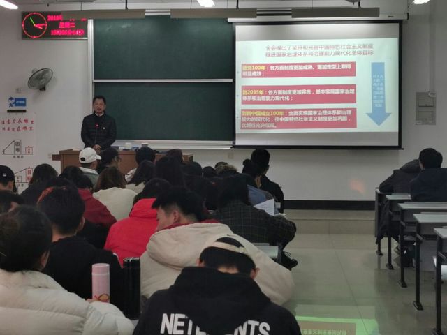 在3206教室,党委副书记黄永莲老师面向2018级本科生进行宣讲。黄永莲老师首先对“学用新思想,奋斗新时代”内涵进行了阐释,新思想即为习近平新时代中国特色社会主义思想,新时代即为从十八大开始进入了新时代。随后黄老师结合自己的学习体会向在座的同学详细讲解了党的十九届四中全会相关内容,使同学们对此次会议内容、意义有了更加深刻的认识和理解。宣讲会最后,黄永莲老师寄语大家,奋斗需要珍惜韶华,奋斗需要前行力量,奋斗需要脚踏实地,号召大家珍惜青春时光,脚踏实地,朝着目标和梦想不懈奋斗。