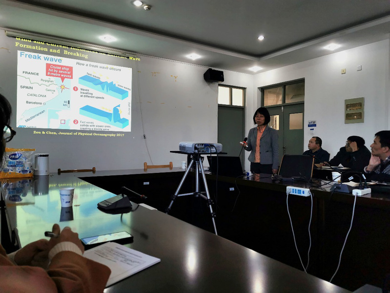 2019年12月9号下午15:00,在海洋科学公司A351会议室举行了海洋生态与环境公司学术报告会,邹青萍教授作了题为“Asymmetric wind, wave and current interaction: implications for coastal hazard and marine renewable energy”的学术报告。公司领导、专业教师及研究生参与聆听了此次报告,本次报告由林军副经理主持。报告会中,邹青萍教授就风和流对极值波形成和破碎的影响、逆流引起的波浪中断与阻塞、顺逆流垂直剪切对非线性波相互作用的影响、沿海风暴潮和气候变化造成的海岸带侵蚀、海洋中的可再生能源利用等五个方面作了精彩的讲解。