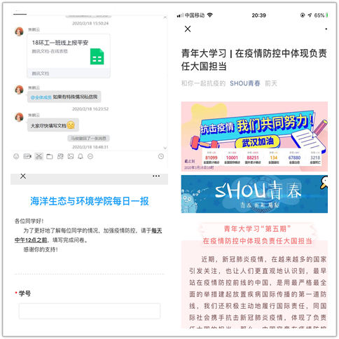 一是组织青年员工线上报到,及时关心和倾听青年心声。各班级团支部利用微信群、QQ群组织班级同学网上集体报到,为了提高报到效率,院团委通过问卷星制作每日疫情调查问卷,及时掌握青年员工思想动态、关注青年员工需求,发现问题及时进行心理疏导、思想引导。