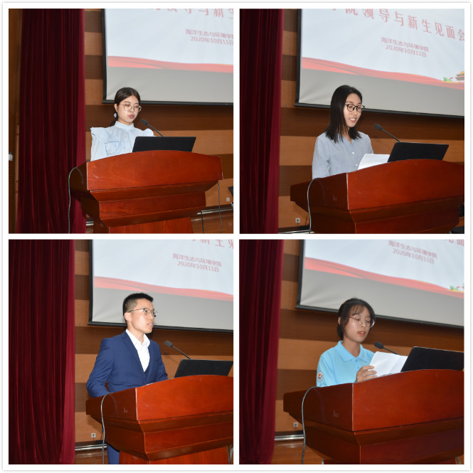 研究生代表林沅回顾了自己的研究生生活,提醒在座的学弟学妹们在科研上要明确目标,自主创新,博采众长,厚积薄发,在海大的三年里辛勤劳作,用心收获,以梦为马,不负韶华。本科生老生代表董奕岑结合自己求学经历,告诉大家学习上要做到“勤”,努力学习,努力实践,让青春色彩绽放。