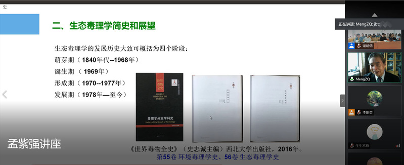 孟紫强教授的讲座主题为“生态毒理学教材体系、学科展望及科研体会”。孟教授结合生态毒理学教材更替历程和多年来生态毒理学教学科研经历,介绍了生态毒理学简史,剖析新老教材特点,分享科研实际案例和体会。