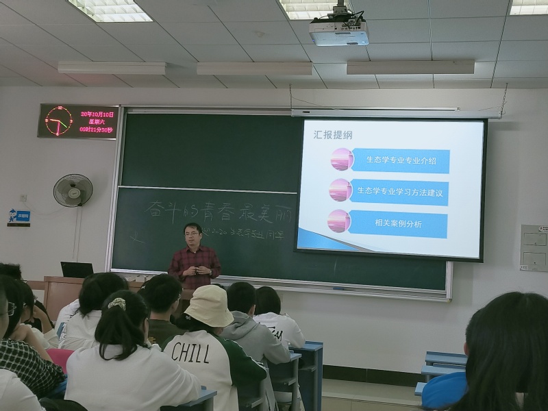 然后,生态专业负责人方淑波介绍了生态文明和“绿水青山就是金山银山”的理念下生态学专业的培养目标与规格、专业特色与特点、主干学科与主要课程、主要实验实践教学环节、毕业学分的要求及教学计划,并结合个人的教育和工作经历,谈了对生态学专业和所从事研究工作的理解,希望大家做好人生规划,做最好的自己。