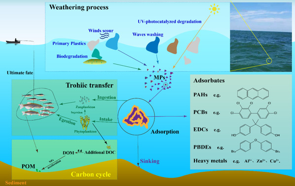 水域和海洋环境中微塑料由于其难降解性,发生长时间迁移过程,受到多种物理、化学或生物作用,发生风化作用,微塑料风化后在环境介质极易与多种污染物结合,被海洋生物吞食,通过食物链进入人体,造成潜在的健康威胁。于飞研究团队长期从事多环境介质微塑料的赋存特征、微塑料表界面行为研究以及微塑料污染控制技术研究,受邀针对微塑料与水环境中有机污染物和重金属的富集行为、作用机制和发展趋势进行综述,系统总结了环境因素对微塑料的物化性质影响和微/纳米塑料与重金属、有机污染物之间的富集行为机理。上述论文的发表为深入研究复杂环境中新兴污染物的长距离迁移与归趋等环境行为提供重要科学依据,为海洋微塑料污染的有效预防和控制奠定了研究基础。