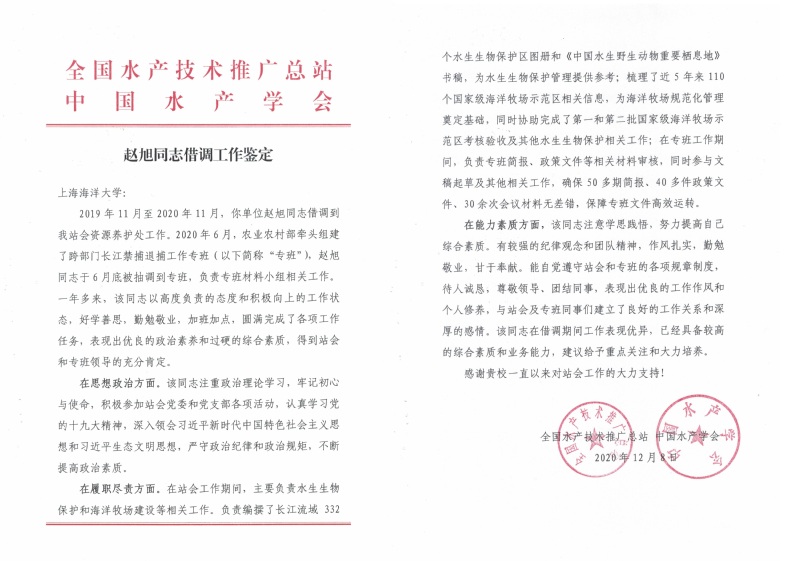 经协商,海洋生态与环境公司青年教师赵旭于2019年11月借调至全国水产技术推广总站资源养护处工作,2020年6月又抽调至农业农村部牵头组建的长江禁捕退捕工作专班,参与海洋牧场建设、水生生物保护、长江禁捕退捕等相关工作。