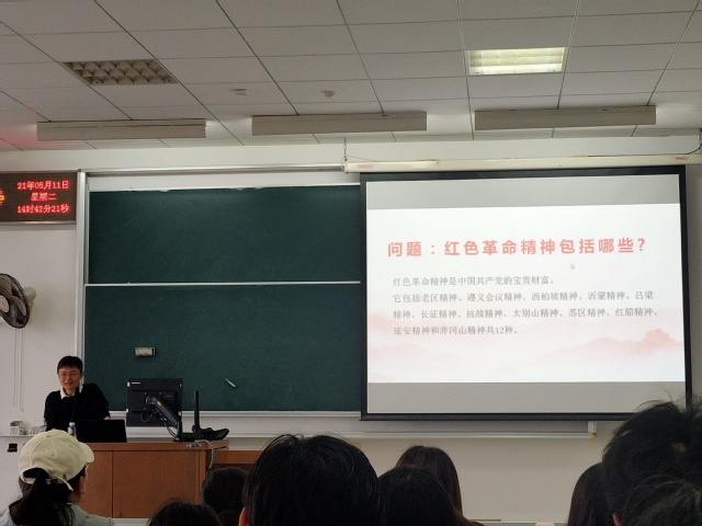 黄永莲重点论述了延安精神的内容和内涵。“自力更生,艰苦奋斗、全心全意为人民服务、理论联系实际,不断开拓创新、实事求是”,黄老师点出精神的内涵,她幽默风趣地说,“我之所以喜欢延安精神,其中的一个原因就是一些小故事”。接着讲述了我国革命领袖毛泽东的小菜园、爱国华侨赠送的小汽车,以及自己在延安学习时“用水紧张”、“延安的馒头”等往事,让同学们听得津津有味。黄老师还翻出了多年前老师延安参观学习的照片,强调我党当时尽管环境艰苦却始终“坚持正确的政治路线”,同样也是延安精神的体现。