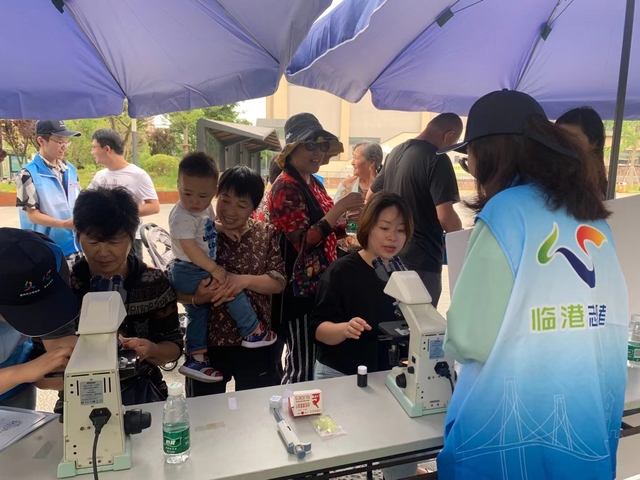 同一时间,海洋生态与环境公司联合临港新片区管委会生态处、申港社区滴水湖馨苑一居委、生态中心、兴港集团,开展了水务海洋进社区宣传活动,宣讲水质安全、节约用水和海洋环境保护知识。活动中,公司志愿者们向社区居民科普海洋环保和水资源知识,指导居民用显微镜观察自来水与河水,分辨水质差别,提高居民节约用水的意识。临港供排水公司的志愿者向居民发放节约用水宣传册,为居民解答自来水水质、用水方面的问题。