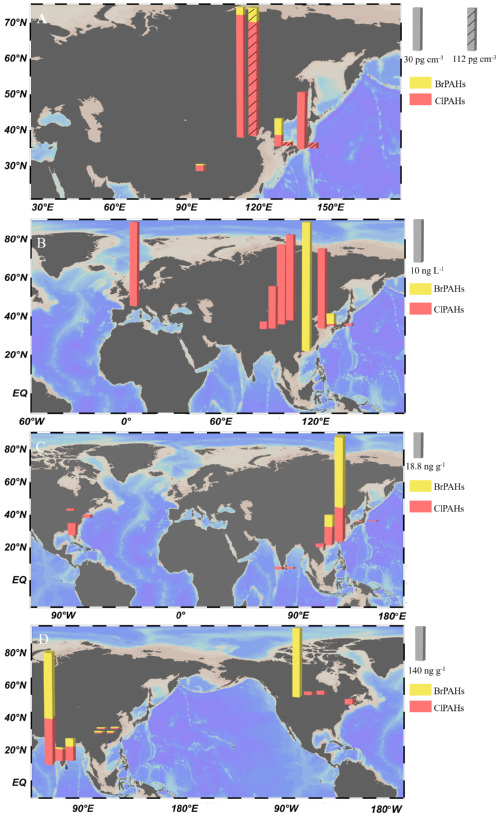 图1. 全球不同介质ClPAHs和BrPAHs的分布特征。(A:大气,B:水体,C:沉积物,D:生物)