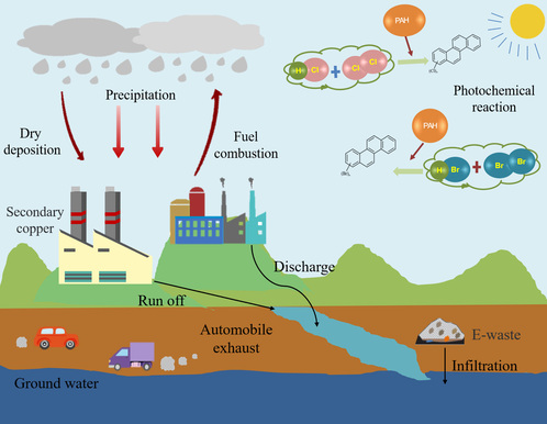 卤代多环芳烃(HPAHs)(ClPAHs和BrPAHs),作为燃烧过程副产品及光化学反应产物,是一类具有一个或多个卤素取代基的致癌化合物,是多环芳香烃(PAHs)卤化衍生物。HPAHs可以在工业过程中存在PAHs和卤素时形成,也可以通过PAHs和卤素之间的(光)化学反应在环境空间中形成。HPAHs因其毒性、远距离传输及生物积累的特性而备受关注,被认为是一种新兴的持久性有机污染物。目前HPAHs已在各种环境基质中被检测到,包括大气、水、沉积物和生物介质。然而,非常有限的报道对它们的来源、环境行为和跨介质迁移转化过程仍缺乏全面的认识。针对这个问题,团队全面调研了相关文献,整理并归纳全球范围内不同介质中HPAHs赋存特征(图1)、并分析其潜在的来源(图2)、影响因素及可能形成途径(图3)。此外,为更好地了解HPAHs,进一步介绍其毒性和致毒机理(图4)、人类的暴露途径(图5)及针对不同介质所应用的分析方法。