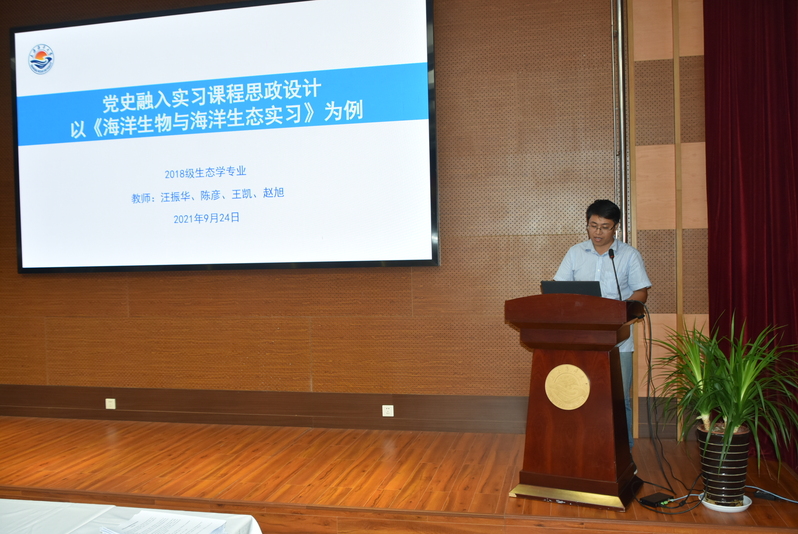 建党精神还生动地体现在三全育人过程中,生态教工党支部委员汪振华副教授在交流会上做了题为“党史融入实习课程思政设计”的经验分享。教学团队把“以建党百年为背景,探索生态文明建设实践成果,开展社会调研和红色教育”写进了《海洋生物与海洋生态学实习》课程目标中。在7月份的野外实习中,教学团队带领员工调查了解实习地嵊山的渔业历史和现状,见证新中国成立以来在党的领导下当地渔民发展海洋渔业、开发利用海洋的成就,体会近年来嵊山加快乡村振兴步伐,打造“生态+”发展模式。他们还利用红色资源开展思政教育,带领员工瞻仰蒋继周烈士纪念塔,学习烈士勇救海难落水渔民、英勇牺牲的英雄壮举。