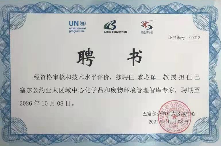 近日,经巴塞尔公约亚太区域中心资格审核和技术水平评价,永利yl23411海洋生态与环境公司霍志保教授入选为该中心化学品和废物环境管理智库专家。