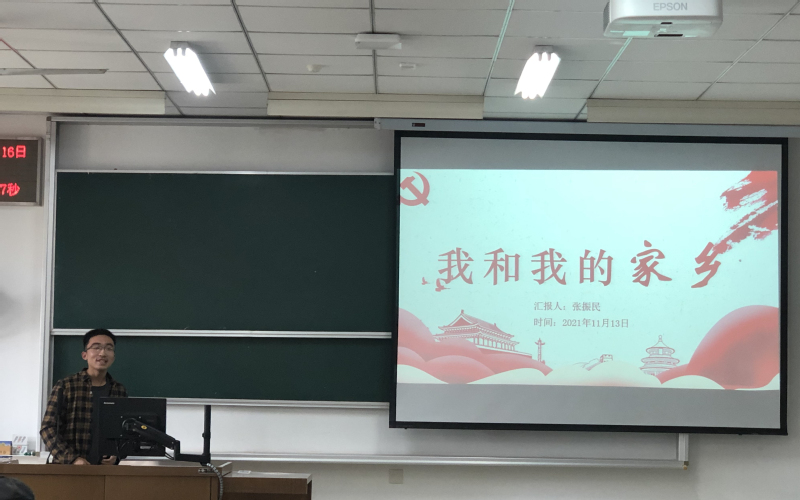 首先开展的是支部特色品牌活动——《我和我的家乡》系列分享交流。来自山东的入党积极分子张振民从家乡红色景点和家乡巨变两个方面分享了自己的故事和感悟。山东革命老区是唯一由中央以省命名的革命老区,从泥路变成水泥路、从狭小教室到宽敞明亮的教室、从农耕工具到机械的设备,家乡无论是基础设施、教育事业还是人们的生产生活都发生了很大变化。近年来还新增了党群服务中心、防火检查站、防疫检查站、纯净水站等“站点”,这一系列变化都给人民生活带来了极大便利。张振民说,“翻看旧照片,可以切实感受到家乡变化之大,我感到很欣慰、很幸福。能够成长在这样一个盛世,每天都朝着美好进发,离不开先辈的努力。我们应该对先辈怀着感恩之心,做一个普通的劳动者,踏实地通过自己点滴的努力,用实际行动把家乡建设成为自己希望看到的新家乡,这也是我自己的努力方向。”