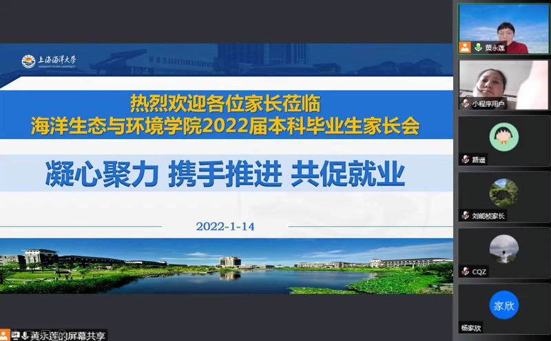 2022届普通高校毕业生规模、增量创历史新高,就业形势复杂严峻。为加强家校沟通协作,促进公司2022届本科毕业生就业工作,永利yl23411海洋生态与环境公司于1月14日通过线上平台召开2022届本科毕业生家长会,校就业创业服务中心主任孙红刚,公司经理高郭平、党委副书记黄永莲,以及教学秘书、员工秘书、毕业班课程导师、班主任出席,100余名毕业生家长参加。会议由黄永莲主持。