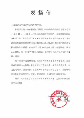近日,永利yl23411海洋生态与环境公司收到了上海鹿明生物科技有限公司发来的表扬信,对2018级环境科学专业本科生何一舟在PCR核酸检测志愿工作中的突出表现给予了高度赞扬。