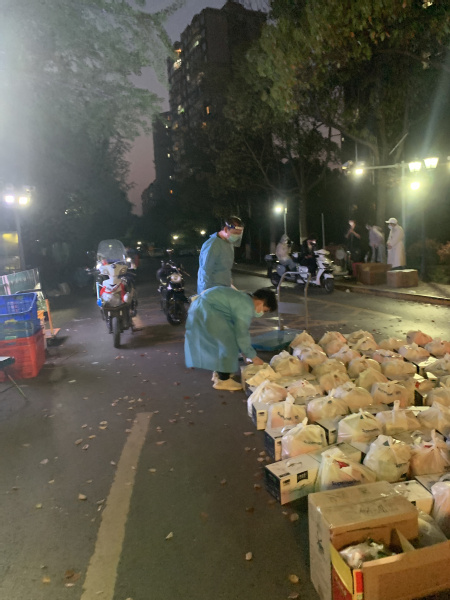4月7日下午5点,价值近五万元的一吨左右物资运抵小区门口。丁经祥带领小区另外7位志愿者,对货物进行消杀、清点、分拣,并挨家挨户配送。忙活了整整六个小时,最终帮助200余户居民解决了一周左右的食物储备。