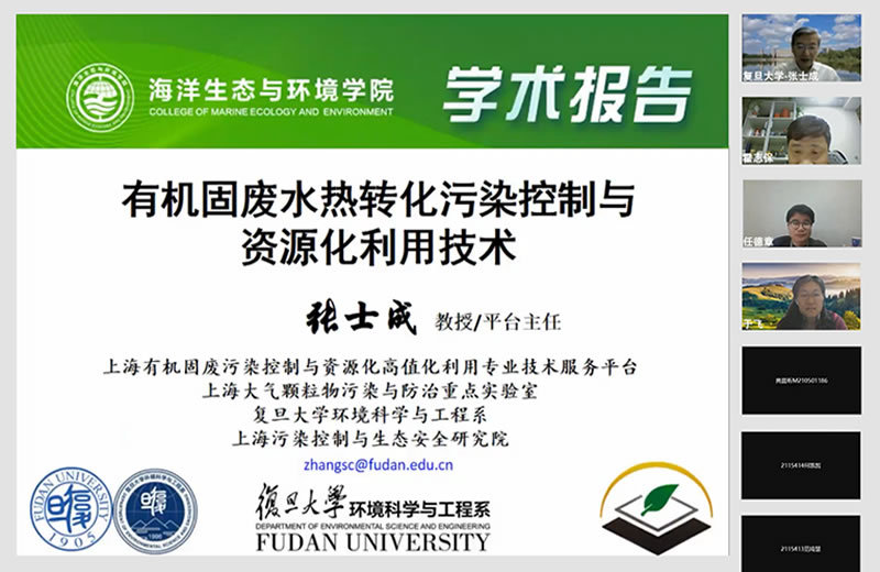 5月5日,复旦大学环境科学与工程系张士成教授应邀以《有机固废水热转化污染控制与资源化利用技术》为主题为永利yl23411海洋生态与环境公司师生在线作学术报告。报告会由环境工程系主任霍志保教授主持,50余名师生在线聆听了报告。