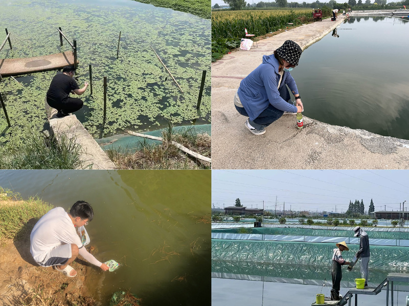 金坛市是江苏省渔业重点区,被誉为“中华绒螯蟹之乡”,在行业内有着“全国养蟹看江苏,江苏养蟹看金坛”的美誉,其渔业科技创新一直走在全省前列。实践团队前往常州市金坛螃蟹养殖基地,对养殖塘及周围环境进行实地考察,采集了表层水、沉积物、养殖生物、渔具和固体废弃物等样品。在靖江、清远、郑州、安庆等四个地区的养殖塘也采集了表层水和固体废弃物等样品。
