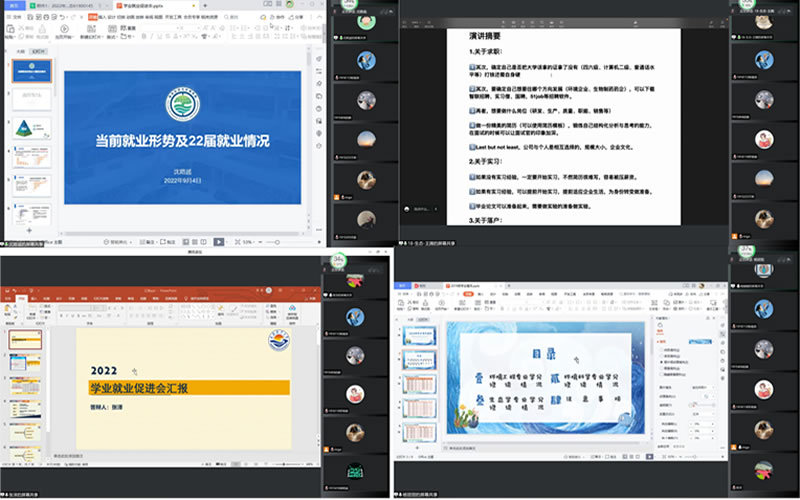 2022届本科毕业生代表蔡雨晴、王腾和张泽分别分享了就业升学经验。就职于赤峰市生态环境局的蔡雨晴首先分析了考公务员的形势,分享了备考公务员的学习方法和心态准备,建议通过听网课、练真题打好基础,合理分配学习时间,考试时注意掌握答题和面试技巧。王腾就职于白帆生物科技(上海)有限公司,他着重从求职、实习和落户三个方面分享了心得体会,鼓励同学们辨明未来发展方向,加强学习,提升就业竞争力。张泽考取了本校研究生,他通过数据对比和亲身感悟介绍了考研形势、备考建议、考研后个人安排和面试经验,提醒同学们及时获取考研信息,合理制定备考计划,建议考研结束后通过参加实习积累经验,发现自身不足。