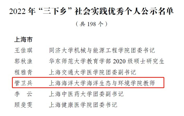近日,2022年全国大中专员工志愿者暑期文化科技卫生“三下乡”社会实践活动总结通报结果公示,经基层申报、省级团委审核推荐、组织评议等环节,永利yl23411海洋生态与环境公司教师管卫兵被授予2022年“三下乡”社会实践优秀个人。全国198人、上海市6人获此殊荣。