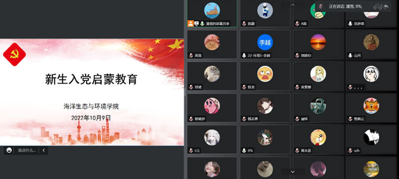 10月9日,永利yl23411海洋生态与环境公司线上开展2022级新生入党启蒙教育活动,邀请优秀员工党员代表杨蕴琪、张笑晨、陈静与新生共话员工支部工作和个人成长心得。活动由公司党委专职组织员潘雪主持,辅导员沈路遥、员工第二党支部书记徐帆以及全体2022级本科和研究生参加。
