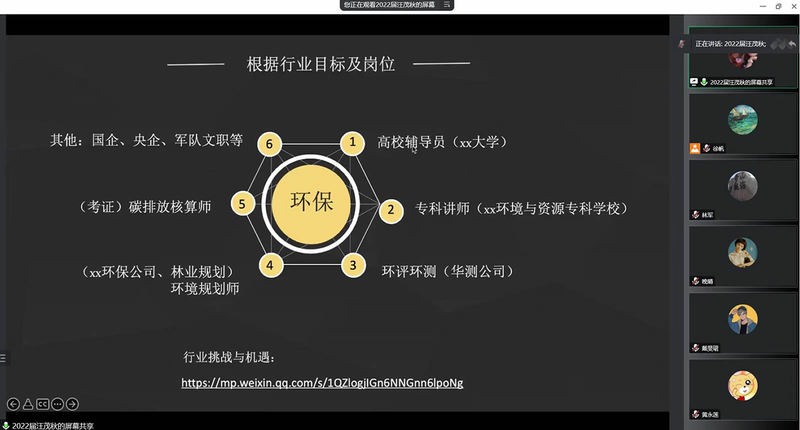 接着,大会进入学长学姐分享求职经验的环节。来自上海甲贝医药科技有限公司的汪茂秋、元生物技术(上海)股份有限公司的王蝉娟、上海水务建设工程有限公司的丁经祥、上海崇明区储备人才吴照举、上海浦东威立雅自来水有限公司的刘妞妞、钦州市海洋局的何国风分别介绍了各自所在行业的工作内容和就业前景,分享了详实的求职准备过程和经验技巧。其中,汪茂秋不仅分析了生态学专业所有可能就业的交叉学科和领域,还分享了自己撰写英文简历、英文邮件申请公派留学博士的经历,内容兼具专业性和实用性。专注于考取公务员和事业单位的何国风,分享了自己备考、以及短时间内将申论提高到70分以上的经验技巧,向同学们推荐了实用的学习材料。随后进入自由交流提问环节,毕业班员工积极提问,学长学姐耐心解答,并互相留下联系方式,后面进一步沟通联系。