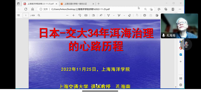 孔海南教授回顾了他的学术成长经历,分享了在日本研究留学、回国到上海交通大学工作、主持国家水污染与控制重大专项工程等34年洱海治理心路经历,特别详细讲述了他围绕洱海治理国家重大水专项的准备、申报、实施过程中遇到的问题和挫折,以及百折不挠,勇往直前,最后获得丰硕成果的喜悦。