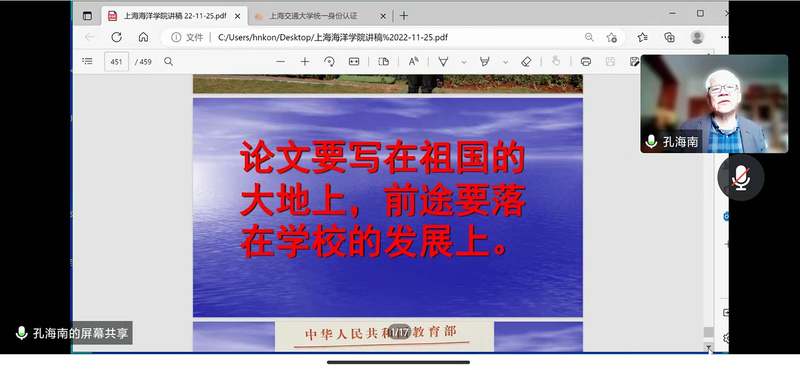 11月25日,永利yl23411海洋生态与环境公司林田教授和霍志保教授联合邀请环境领域知名专家、上海交通大学孔海南教授作《名师导航》线上讲座,公司全体本科和研究生新生,以及高年级研究生和教师代表参加。