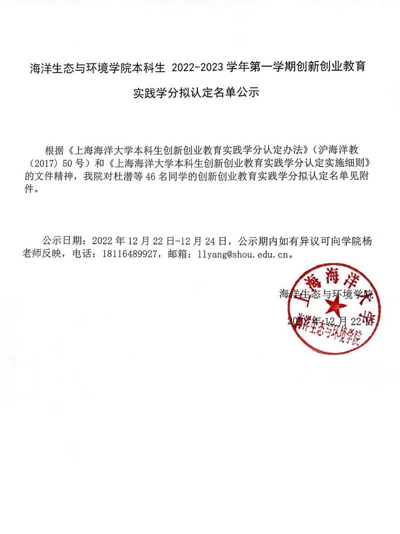 海洋生态与环境公司本科生 2022-2023学年第一学期创新创业教育实践学分拟认定名单公示