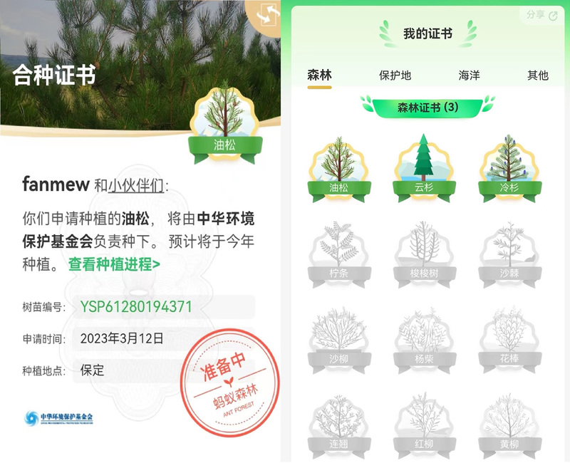 中国植树节是为促进国土绿化、保护人类生态环境而设立的节日。2020年7月1日起,新修订的《中华人民共和国森林法》施行,确定每年3月12日为植树节。蚂蚁森林是支付宝客户端的一项公益行动,用户通过步行、地铁出行、在线缴纳水电煤气费、网上缴交通罚单、网络挂号、网络购票等行为,减少交通碳排放能量,积累的能量可在支付宝养一棵虚拟树。公益组织、环保企业等蚂蚁生态伙伴们可认领用户在蚂蚁森林里种植的虚拟“树”,在现实世界种下一棵实体树。