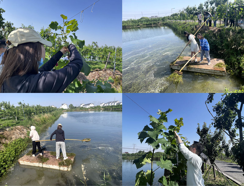 随后,才老师带领员工们进行了水草打捞和葡萄藤蔓固定。员工一一接过工具,跨上池塘浮板对浮在水面上的水草进行打捞清洁。同时,池塘边一位位同学将葡萄藤蔓捆绑固定到架子上。员工们在具有海大特色的劳动教育实践中磨砺意志、锤炼本领,大家纷纷表示,真正参与劳动,才更深入地领会了习近平生态文明思想的伟大,感受到认真学习专业知识的重要。
