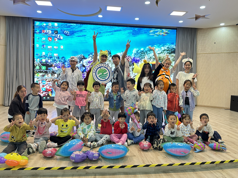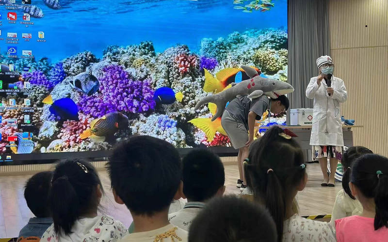 情景剧讲述了海龟圆圆、企鹅奥利奥、北极熊奶油、鲨鱼灰灰、小丑鱼尼奥到医院找海洋小医生看病的故事,穿插播放科普动画片、纪录片,讲述塑料垃圾、全球变暖、非法捕捞野生动物、石油泄漏对海洋生态环境造成的危害。幼儿园小中大班三个年级的小朋友观看了表演,生动有趣的造型和风趣幽默的台词令他们忍俊不禁。员工第二党支部为每个小朋友分发了气球,小朋友们积极参与互动答题,巩固观看情景剧学到的海洋保护知识。