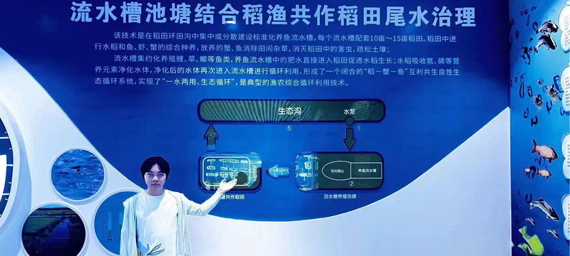 管卫兵教授团队研究生带领观众参观了黄河经济鱼类水产种质资源场、黄河渔文化馆和 “稻渔空间”。团队长期扎根宁夏,大规模推广陆基生态渔场构建技术,服务西部脱贫攻坚和乡村振兴。通过改变传统耕作方式,整合资源生态学、多营养级水产养殖理论,优化稻田和养殖系统布局,实现大规模水产和农作物、畜禽的综合生态化利用,形成以陆基渔场为主体的立体复合农业生态系统,有效推动了宁夏地区一二三产业的融合发展,稻渔空间也被农业农村部评为中国美丽休闲乡村。