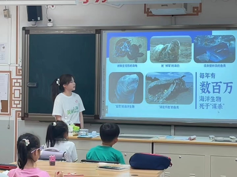 《守护粮心,不遗余粒》主题课向孩子们解释粮食的珍贵和粮食浪费带来的环境和资源压力,通过互动游戏、趣味实践等方式让小朋友们深刻认识到每一粒粮食来之不易,引导他们树立环保意识,形成节约资源的良好习惯。《拒绝白色污染,争做减塑达人》主题课组织环保知识竞答,在轻松愉快的氛围中学习减塑方法和环保技巧,向孩子们传递减塑理念,培养他们共同创造一个无白色污染的美好世界的环保责任感。在《保护水环境,争做河小青》的课堂上,团队成员们通过图片、视频向小朋友们介绍河长制,解释保护水环境对人类和动植物生存的意义和保护江河湖泊的重要性,激发未来环保意识,希望他们共同守护水资源,建设美丽家园。《爱‘沪’生态绿家园,践行低碳新时尚》主题课通过互动游戏向小朋友们讲解野生动物知识,让他们深刻认识野生动物在维持生态平衡中的作用,传递对野生动物的关爱和保护生态环境的意识,引导他们成为低碳环保的生态守护者。