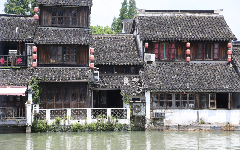 在泖河地区有诸多文物古迹,如泖塔、泰安桥、圆津禅院、青龙寺等,其中朱家角古镇较为人熟知。沿途中,小组成员发现当地建筑大多依水而建,大部分为具有江南特色的青瓦白墙。在村镇发展过程中,朱家角古镇尽可能地保留了古村镇古建筑的原始面貌,在其基础上加以商业化,在促进旅游业发展的同时,让人们更好地感受当地历史风貌。