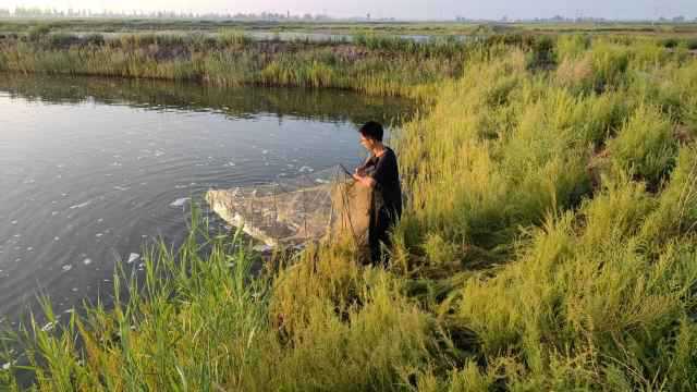 余鑫瑞在池塘起虾笼