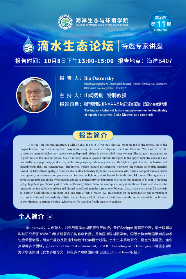 滴水生态论坛(27)| 物理因素和过程对水生生态系统功能的影响:以Kinneret湖为例(Ilia Ostrovsky)