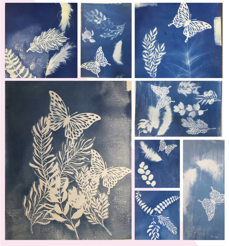 据了解,蓝晒又称蓝图晒印法,是非物质文化遗产,也是一种古典摄影技术。唯美图案在阳光照射下逐步显现,仿佛是太阳的魔法,妙趣横生。学员们小心翼翼地将蓝晒液均匀涂抹在卡纸上,待避光晾干后将叶子、蝴蝶等素材巧妙结合,制作属于自己的创意图案,随后拿到阳光充足的地方暴晒。在紫外线作用下,卡纸表面颜色发生变化,花纹图样逐渐显现。晒好的卡纸在流水中冲洗晾干,淡蓝色卡纸变成靛蓝色,完成一幅幅独特的蓝晒作品。蓝晒作品将用于公司展示和个人收藏。