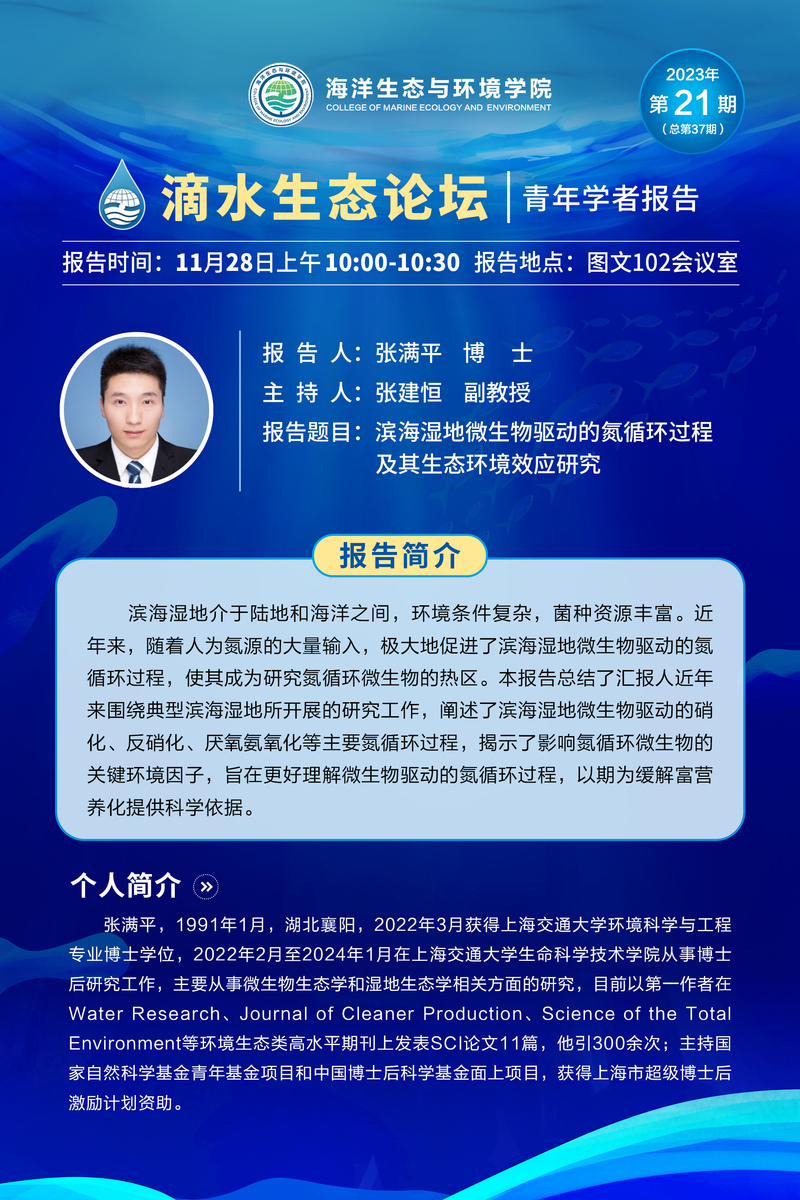 滴水生态论坛(37)|滨海湿地微生物驱动的氮循环过程及其生态环境效应研究(张满平)