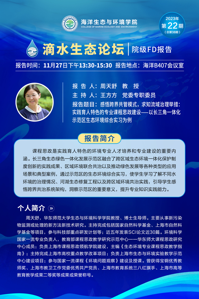 滴水生态论坛(38)| 感悟跨界共管模式 求职流域治理举措 实践育人特色的专业课程思政建设(周天舒)