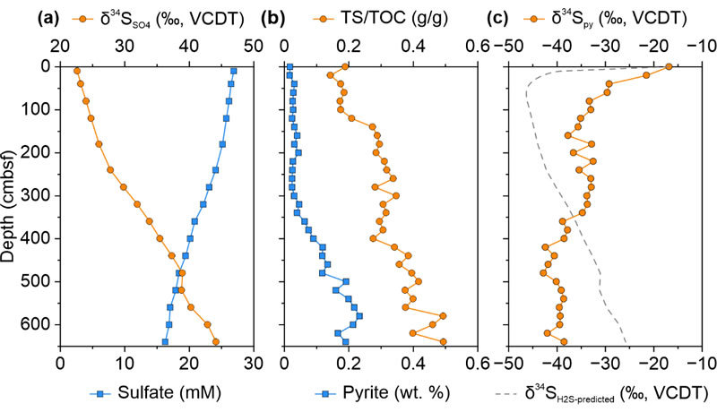 图1. 南海东沙沉积柱状样地球化学数据随深度分布剖面图:(a)硫酸盐浓度和δ34SSO4值;(b)黄铁矿含量和TS/TOC比值;(c)黄铁矿和预估H2S硫同位素组成(预估假设:微生物硫酸盐还原过程硫同位素分馏程度在表层最低,随深度增加快速增加至平衡分馏程度70‰)。