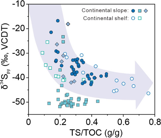 图4. 黄铁矿硫同位素与TS/TOC比值关系图,其中紫色箭头表示δ34Spy随TS/TOC比值增加而下降的趋势,数据收集自大陆架、大陆坡等沉积环境。