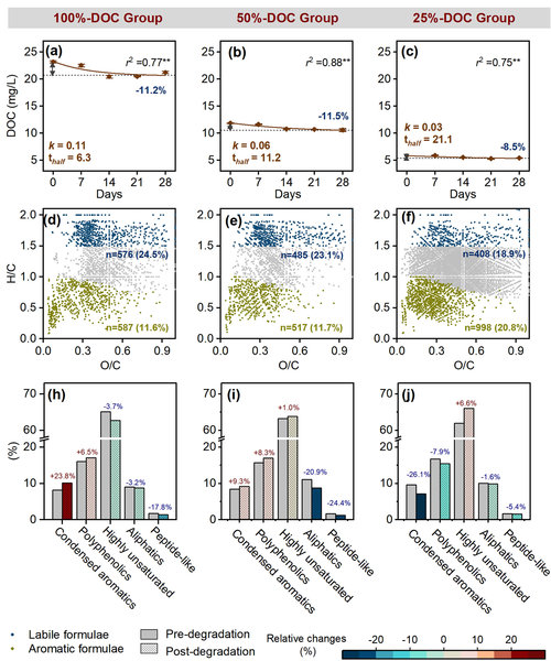 高分辨率质谱数据揭示了微生物在不同DOC浓度条件下的代谢策略。在高DOC浓度的培养体系中(100%-DOC和50%-DOC组),微生物有更多可利用的有机物资源,因此表现出优先选择那些能量回报较高的底物,如肽类分子。这种分子结构的选择性利用导致了这些易降解DOM的快速消耗。然而,在低DOC浓度的培养体系中(25%-DOC组),微生物仅依赖特定类型的底物可能无法获取足够的能量,因此必须利用任何可用的DOM分子,即使这些分子具有更低的能量回报。在冻土有机碳中,芳香类化合物相对于肽类物质具有更高的丰度,因此与高浓度对照组相比,在低浓度的底物条件下,微生物消耗芳香类化合物的量显著增加。这种策略的变化可能影响了DOM的降解速率和路径,及最终的碳循环过程。