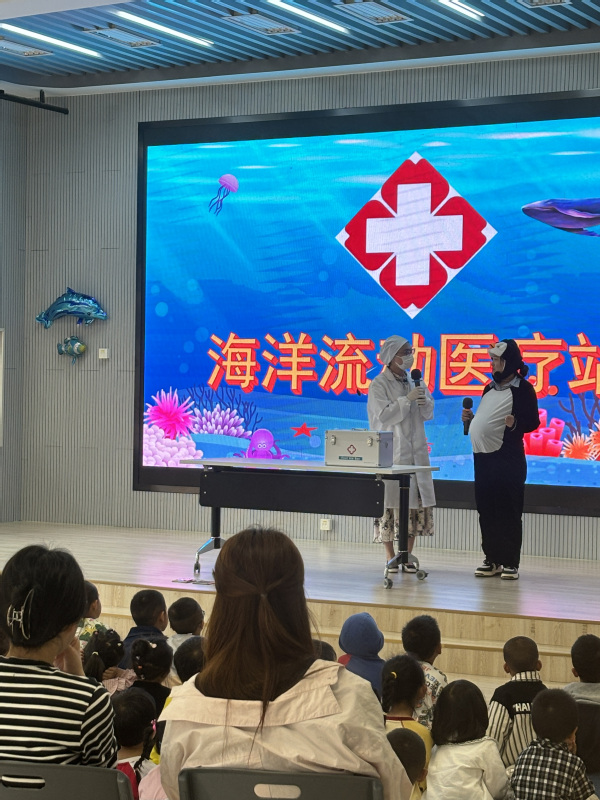 情景剧讲述了海龟圆圆、企鹅奥利奥、北极熊奶油、鲨鱼灰灰、小丑鱼尼奥到医院找海洋小医生看病的故事,穿插播放科普动画片、纪录片,讲述塑料垃圾、全球变暖、非法捕捞野生动物、石油泄漏对海洋生态环境造成的危害。不同年级5个班的小朋友观看了表演,他们第一次接触到“世界海洋日”,倍感新奇。生动有趣的造型和风趣幽默的台词令他们欢呼雀跃。提问环节,小朋友们积极参与互动答题,巩固海洋保护知识。