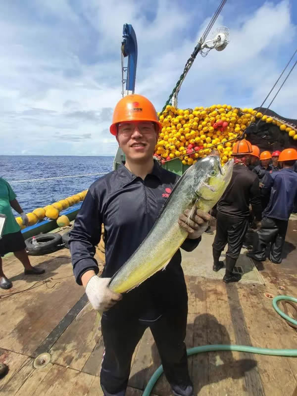 比如,海上遮挡物少,视野开阔。蔡丰宜喜欢拍照,在他的相册里,积累了很多壮阔的景象。有海上的日出日落,也有捕捞金枪鱼的收获时刻。太平洋上空的彩虹、炫目的晚霞、突发的气象风暴……这些都让蔡丰宜在感叹大自然魅力的同时,油然而生对远洋事业的敬畏心和职业自豪感。每每有同学打听远洋船上的一切,他也会鼓励心动的同学来体验。“如果自己没有明确的职业目标,那就勇敢尝试。”