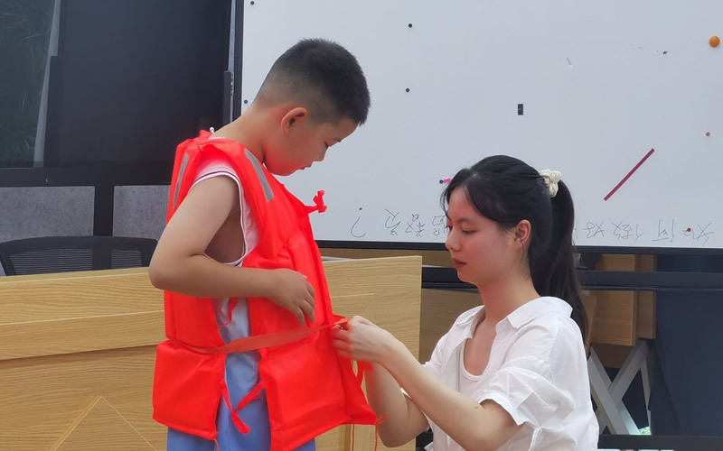 救生衣就是“救命衣”,是危难时刻确保生命安全的最后一道“护身符”。实操环节,小组成员首先向市民们详细演示了救生衣的正确穿戴方法。他们特别准备了适合儿童的救生衣和穿戴教程,确保每位参与者都能掌握这一基本自救技能。“为了自身安全,请在船上活动或临水作业时一定要按规定正确穿着合格的救生衣!”