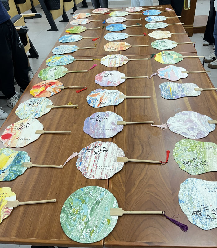 一桶水,一把扇,几滴大漆。扇入水内,色彩随机附着于扇面,一半人为,一半天成。印有“盛世中华”“国泰家和”的扇面在党员们的精心设计和制作下,一一着上了绚丽的色彩,好似大美中华,锦绣山河。在作品展示环节,党员们纷纷拍照留念,记录下漂漆扇与众不同的美。