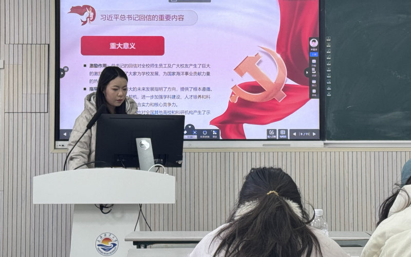 支部副书记夏坤首先带领全体党员重温入党誓词。大家面向党旗庄严宣誓,表达不忘初心、牢记使命的坚定信念。宣传委员李岭岚详细解读了习近平总书记回信中的重要内容,强调海洋高等教育在科技发展和国家战略需求中的重要地位,以及培养更多优秀海洋人才的历史使命。