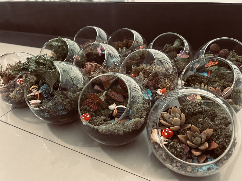 盆栽种植环节以实践呼应理论。学员们亲手挑选多肉和绿植,科学搭配土壤、石子与营养层,打造出简约而富有生命力的“微型生态系统”。从铺设透水层到植入植株,每一步都严谨细致。一盆盆绿意盎然的生态球不仅是辛勤劳动的成果,更承载着学员们“守护绿色、低碳生活”的郑重承诺。